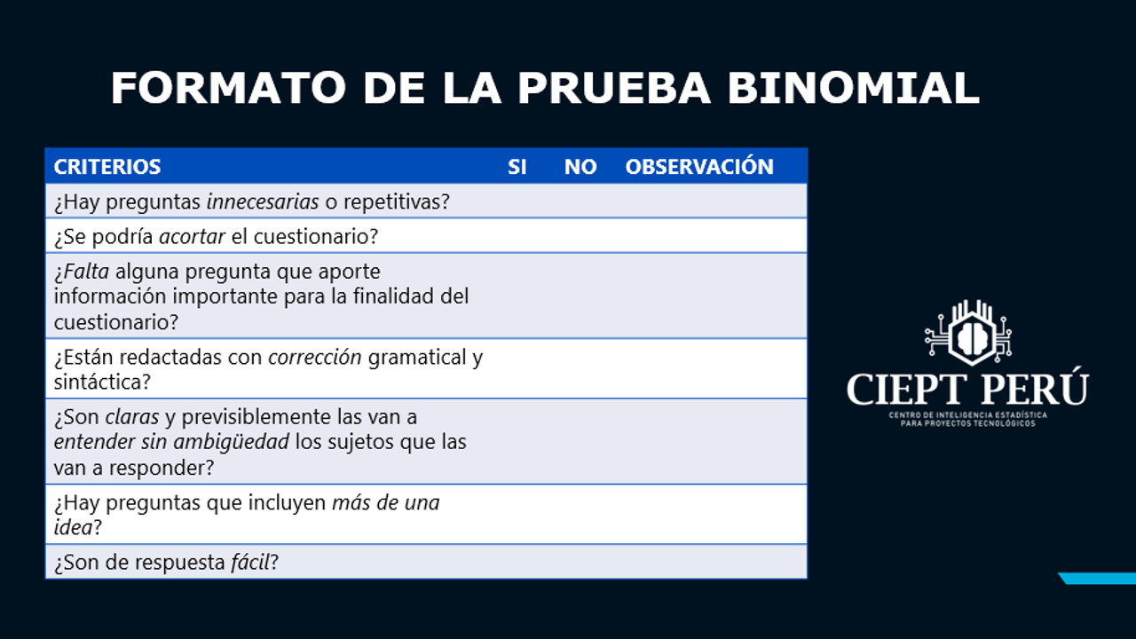 La prueba binomial en si es una distribución relacionada con el éxito o fracaso de una situación en nuestro caso de que una pregunta cumpla el objetivo de medir lo que queremos medir.